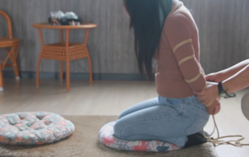 棕色毛衣牛仔裤,白色毛衣运动裤两套衣服。反扭五花大绑。模特丰乳肥臀看起来还是很棒的。