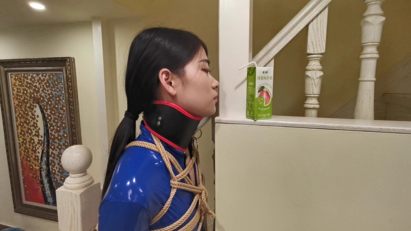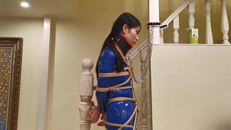 穿着一身蓝色皮衣,高跟鞋。被绑在楼梯栏柱上。脖子被戴上强制抬头的脖套,并用铁链拴起来。旁边放着饮料,想要喝到却很艰难,不断的移动最终成功喝到。长时间的站立让小冷的脚丫像触电一样的疼,1小时的罚站让小冷非常煎熬的扭动身体挣扎。