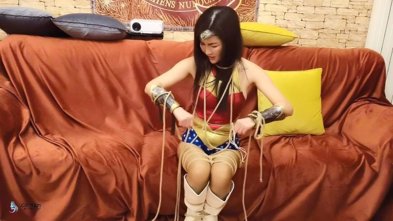 女超人潜入房间调查,却不知自己已经身陷陷阱中。发现桌上有很多绳子,正在疑惑时候,一条绳子从后面突然袭来缠住了她的脖子,并将她拉到沙发上。女超人奋力的挣脱着。但她的脚也被绳子缠绕束缚了起来。双手也被绳子缠绕,拉扯到身后束缚起来。越来越多的绳子开始向女超人袭来,被束缚的女超人只能惊恐的挣扎着。。。