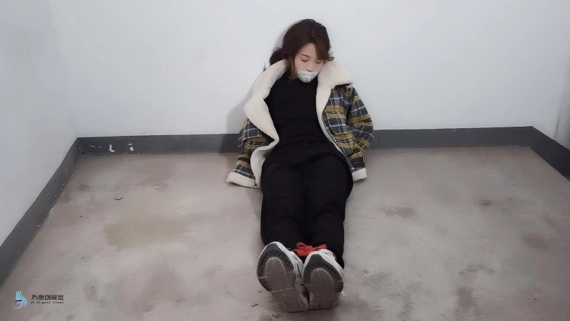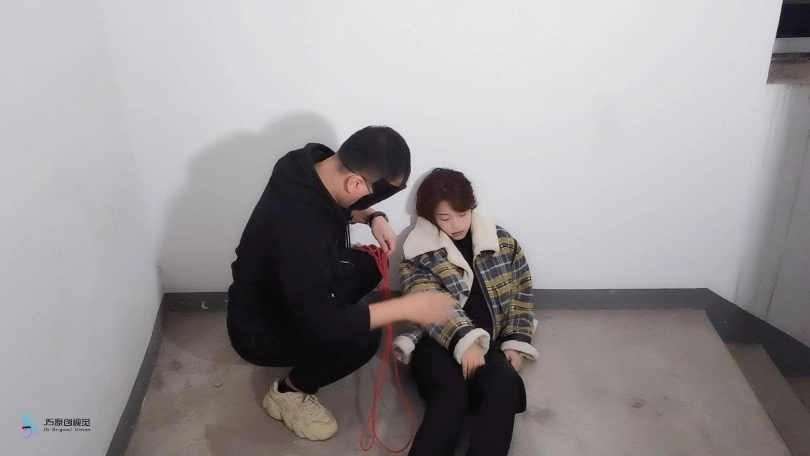 女孩在上楼梯时,被埋伏多时的男人袭击,最后晕了过去。女孩被捆绑堵嘴放置在楼道中。