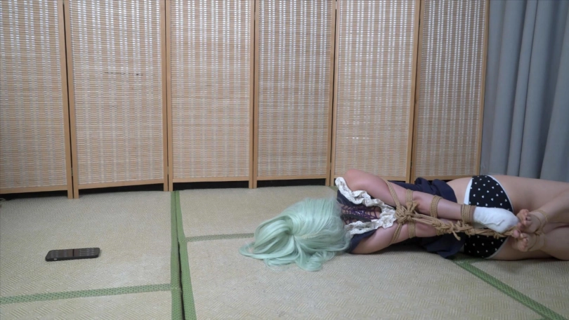 手包起来以后,直臂并肘,戴上口球,站立用脚寻找手机