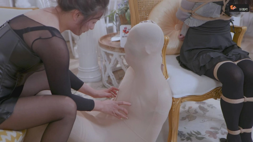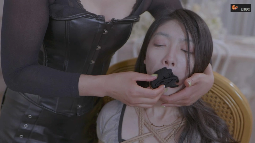 这时,小王的媳妇忽然冲了进来,她一直定位了老公的手机,看到老公去了一家旅馆,就跟来了,然后就看到了老公被虐的场景,还发出享受的呜呜叫。小王媳妇现在也不知道自己是生谁的气,上去就和女老板拼命,两人在被绑着的小王面前打了起来,小王在两双黑丝美腿中间左右摇头呜呜呜叫,也没法帮谁,最后还是小王媳妇被打倒了,被女老板紧紧的绑了起来,还堵住了嘴,让她看着自己虐小王。小王媳妇看到自己老公被虐的那么爽,很是生气,拼命的挣扎,可是无济于事。最后女老板玩腻了,把小王媳妇和小王的眼睛和嘴巴都用胶带封住,嘴巴和眼睛都是绕一圈的那种封,然后抱着她们两个睡着了,三人一起躺在床上,王丽在中间,抱着被捆绑蒙眼封嘴的两人睡觉。两人哪里睡得着,在拼命挣扎,女老板倒是睡的很香......