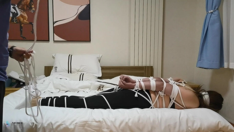 用白色绳子将她的全身严密的捆绑起来,胳膊放在身后绑成直臂。嘴里塞进丝袜,外面用胶带封住。在给她戴上一个口罩。用绷带缠绕她的口鼻处。再将她的脚和手臂相连接绑成驷马。如此严密的紧缚使她痛苦挣扎。把一个[X_X]放在她的下面刺激着她。被绑成这样她无法动弹,只能体验着自己身体压着棒子传来的[X_X]。