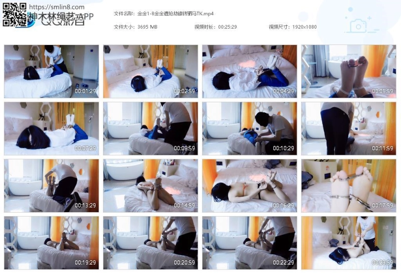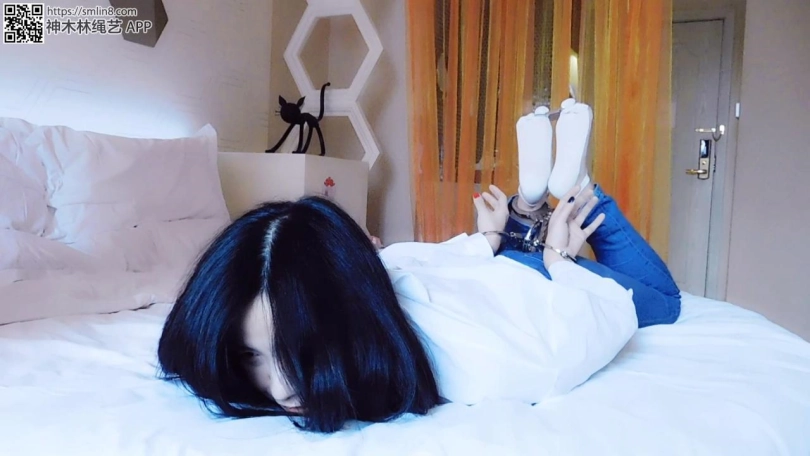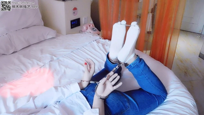 妹子自己进来,然后坏人敲门,妹子好奇打开了门,遇到抢劫,放到妹子,戴上手铐。脱下鞋,锁上脚趾铐、脚铐,手脚用板铐连起来,驷马锁住。妹子挣扎喊叫,恐惧。劫匪出现,解开镣铐,脱下袜子、衣服,只剩下内衣,再全部锁好,锁上脚心,脚趾铐、拇指铐,袜子堵嘴,塞上蛋蛋。妹子内衣挣扎喊叫,恐惧。坏人再次出现,逼问密码,拿出三筒把脚腕脚趾连起来,然后开始挠脚心。后来换个角度。