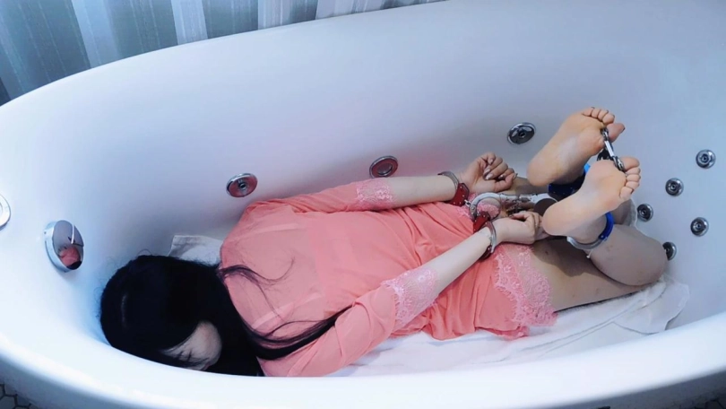 妹子下班刚回家,准备休息。忽然发现桌子上有个纸条,写着什么神奇的魔法,希望人们来试试看。妹子看到后很不屑,觉得就是糊弄小孩子的,就喊了一句“变变变”。妹子发现被戴上了脚镣,很震惊,拔也拔不出来,床上找找钥匙也没有,就下地找找钥匙。妹子怎么也弄不下来,这下有点担心魔法了,有点相信了,于是又喊了一下。这次更麻烦了,脚腕换成了脚铐,脚趾也被锁了,很着急,在地上走了两圈,还是弄不下来。这下很害怕这个魔法了,于是又喊了一下。接着妹子发现一只脚被拴住了,跑不了了,还被塞入了蛋蛋,穿上铁内裤,手被固定在腰间。妹子很着急,企图努力把脚拔出来,但却没用。妹子苦于万般无奈,又喊了一句魔法。最终妹子被驷马锁在浴缸里,鞋也被脱掉了,脚趾和脚腕还连在了一起,妹子着急的哭了出来,不断挣扎,咒骂坏魔法。
