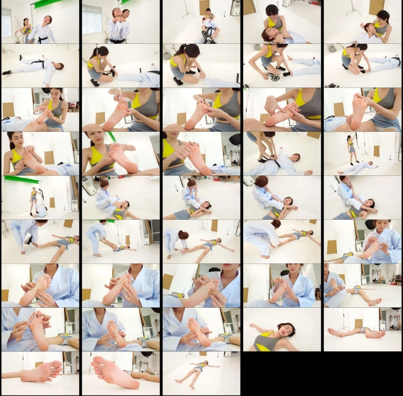 Mimi (Karate Gi) has a fighting match with Elsa. Elsa won the first round, she removed Mimi`s Shoes and Socks and had fun with Mimi`s soles. Mimi then had a comeback and had fun with Elsa`s soles.