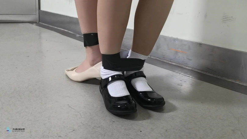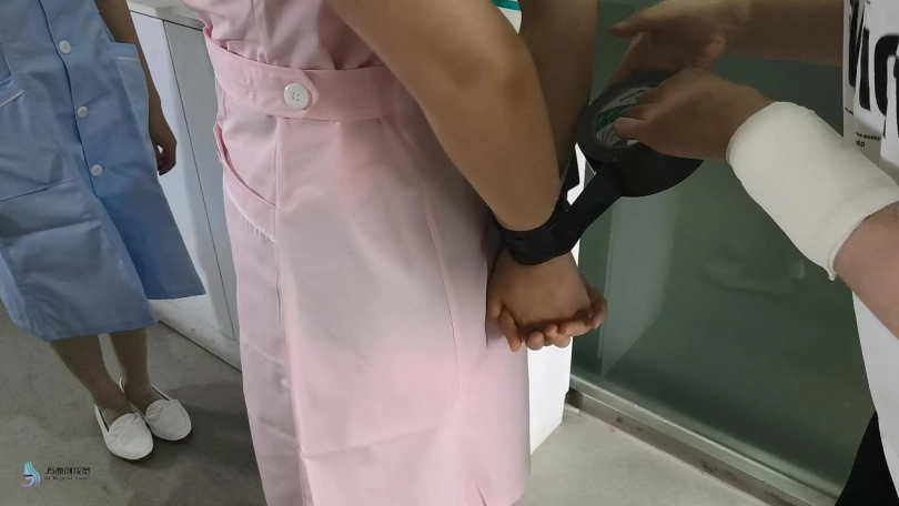 下一个镜头:此时,医生及病人只穿上内衣及鞋子已被黑色胶带从后绑起了手腕及足踝;并背对背被黑色胶带绑起。她们站在病房储物柜前,嘴已被黑色胶带封上。护士B双腕已被棕色胶带从后绑上,嘴里塞上棕色毛巾坐在病房近储物柜那边的床上。身上只剩胸罩,内裤及白鞋。而护士A在身上只穿着胸罩,内裤及白鞋,口里塞上棕色毛巾。强盗威胁她捆绑护士B的足踝及以黑色胶带封上护士B的嘴。完成后,强盗叫护士A把手放在背后,然后上前把她的双腕,足踝像护士B般绑上及封上嘴巴。跟着安排她并排地坐在护士B身边。强盗跟来到另一张床上并检查各女士们所脱下的衣服有藏着银行卡。看着 4 名女子在挣扎及呼叫,抢劫犯走近4个女孩,一个接一个地取走她们的堵嘴物,要卡密码。在女孩们说出密码后,她们又被堵嘴起来。抢劫犯对那些女孩说谢谢,并请她们不要报警待在病房,不要试图逃跑。那些女孩不停地尖叫着,听到强盗走后试图逃离病房。他们从病房跳了过来到主入口。