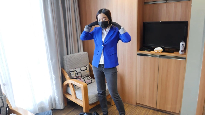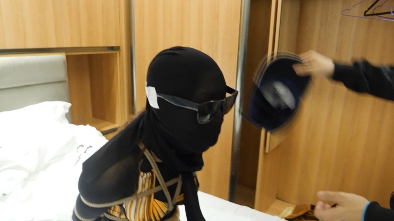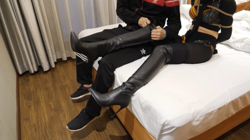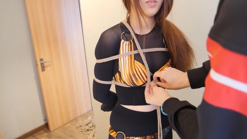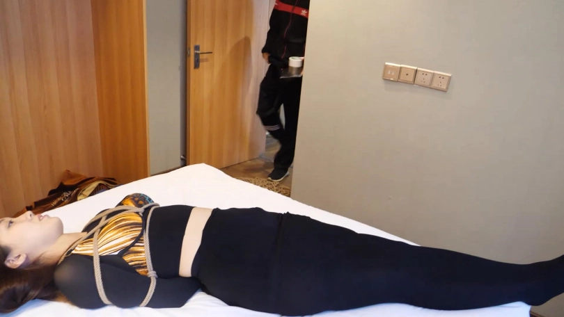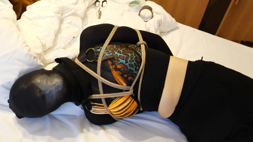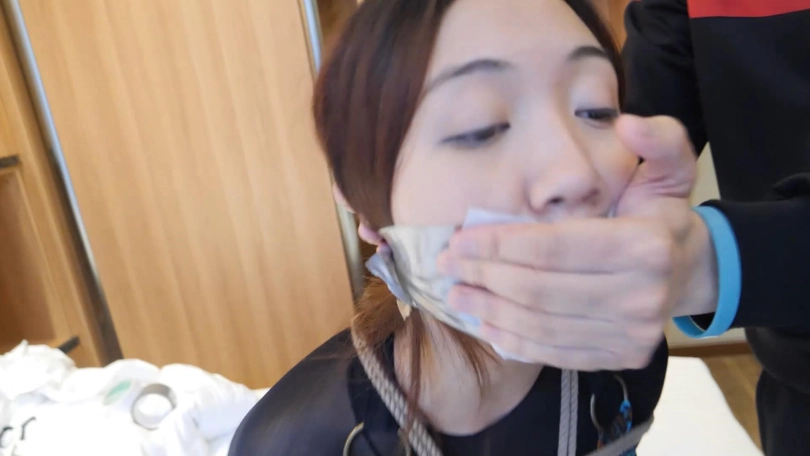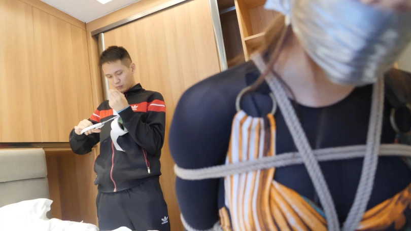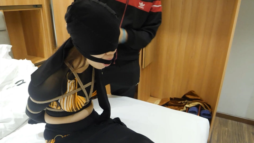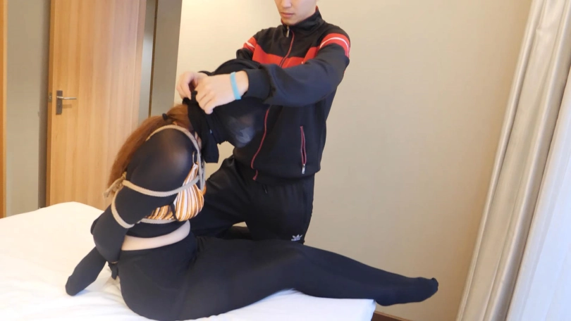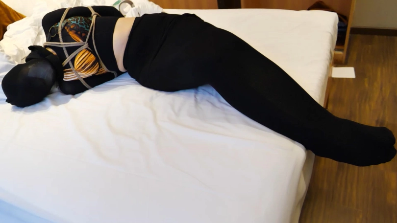 这时电话想咯,一个陌生号码来电,杨敏接起电话,喂你好请问哪位。电话另一头响起刘新的声音,还记得我吗,被你送进去三年,现在我出来了有点事情想找你,杨敏也问什么事,小心我又把你送进去,呵呵刘新笑道你不想见你女儿了吗,杨敏听到立即问我女儿在哪,刘新说道你女儿很安全如果你不配合,就不安全了,杨敏立即说道好我配合。半小时后我会到你家,记得开门不许报警,另外把你家里的丝袜找出来等我,在我来之前自己用一只黑色短丝袜装几双黑色短丝袜套在一起塞进嘴里,戴上口罩,用黑色短丝袜套住左右手,穿一条牛仔裤,然后下楼等刘新来杨敏家里,记住如果你不照做你的女儿后果自负。刘新说道,杨敏无奈的答应了。找出了所有的丝袜,堵上嘴,在穿着黑色丝袜的腿上套.上牛仔裤穿上高跟凉鞋,戴上口罩出门等刘新到来。半个小时后刘新来到,见到刘新,杨敏呜呜呜呜,刘新说道走带我进你家里去再说,杨敏带着刘新进入家门。刘新笑道看来挺乖嘛照做了,等下我带你去找你女儿。为了防止你不配合我得把你绑起来,杨敏无奈的答应了,那好现在把衣服裤子脱了包括内衣,丝袜,没办法杨敏只能脱,脱干净衣服后,戴着口罩的杨敏站在原地等着刘新绑她,刘新说道你可以把口罩取下来了自己把嘴里的丝袜吐出来,杨敏取下口罩,费了好大劲才吐出嘴里发涨的丝袜。刘新拿来一条黑色丝袜,剪开档部从杨敏头上套下去拉在身上套好就像穿了一件紧身内衣,将左手穿进一只袜腿,右手穿进另外一只,看上去就像内衣长袖,穿上两条黑色丝袜,穿上比基尼,刘新用绳子给杨敏绑了个倒拜观音,用黑色丝袜绑住大腿根部,用丝袜绑了个丁字裤。用一条黑色丝袜套住穿着两条黑丝袜的双腿,拉到腰部(拉到腰部不是全班)绑好了没有,好了就带我去见我女儿杨敏问道,刘新笑道马_上还差一点,把你的嘴堵.上,来把嘴张开,刘新用杨敏脱下的丝袜塞进杨敏嘴里,把嘴闭紧,我要给你封胶带了,杨敏费了好大的劲才闭上嘴,刘新用胶带交叉贴住杨敏的嘴。黑丝蒙住眼睛用一条黑色不透肉丝袜套住头,刘新吧杨敏放在穿上,说道在这等我,我去办点事然后带你去见女儿,杨敏无奈点头。几个小时后刘新回来了,他问道杨敏现在我解开你的嘴,但是不许大喊大叫,莫非你想一直被堵着嘴,杨敏听到连忙摇头又点头,刘新拉起套在杨敏头,上的丝袜,将丝袜拉到鼻子下位置,露出胶带的位置,撕开胶带掏出嘴里丝袜,杨敏立刻问道你还不带去见我女儿混蛋,呜呜呜呜,刘新又把杨敏平时穿的黑色短丝袜塞进去然后又塞进一条丝袜,用丝袜蒙住口。笑道我现在就带你去见女儿,叫你别叫你还叫,看来还是堵着你的嘴。刘新将杨敏鼻子处的丝袜拉下来,套住头。戴上眼镜,口罩,太阳帽,过膝高跟鞋,穿好蓝色制服,外套,用一条黑色丝袜当围巾缠在脖子上让人看不到绳子,穿上风衣出门了,走在路上,刘新搂着杨敏恶狠狠的说道,现在听话点,靠着我走,如果敢反抗你就别想见女儿,杨敏连忙摇头又点头小鸟依人的靠着刘新一起走。