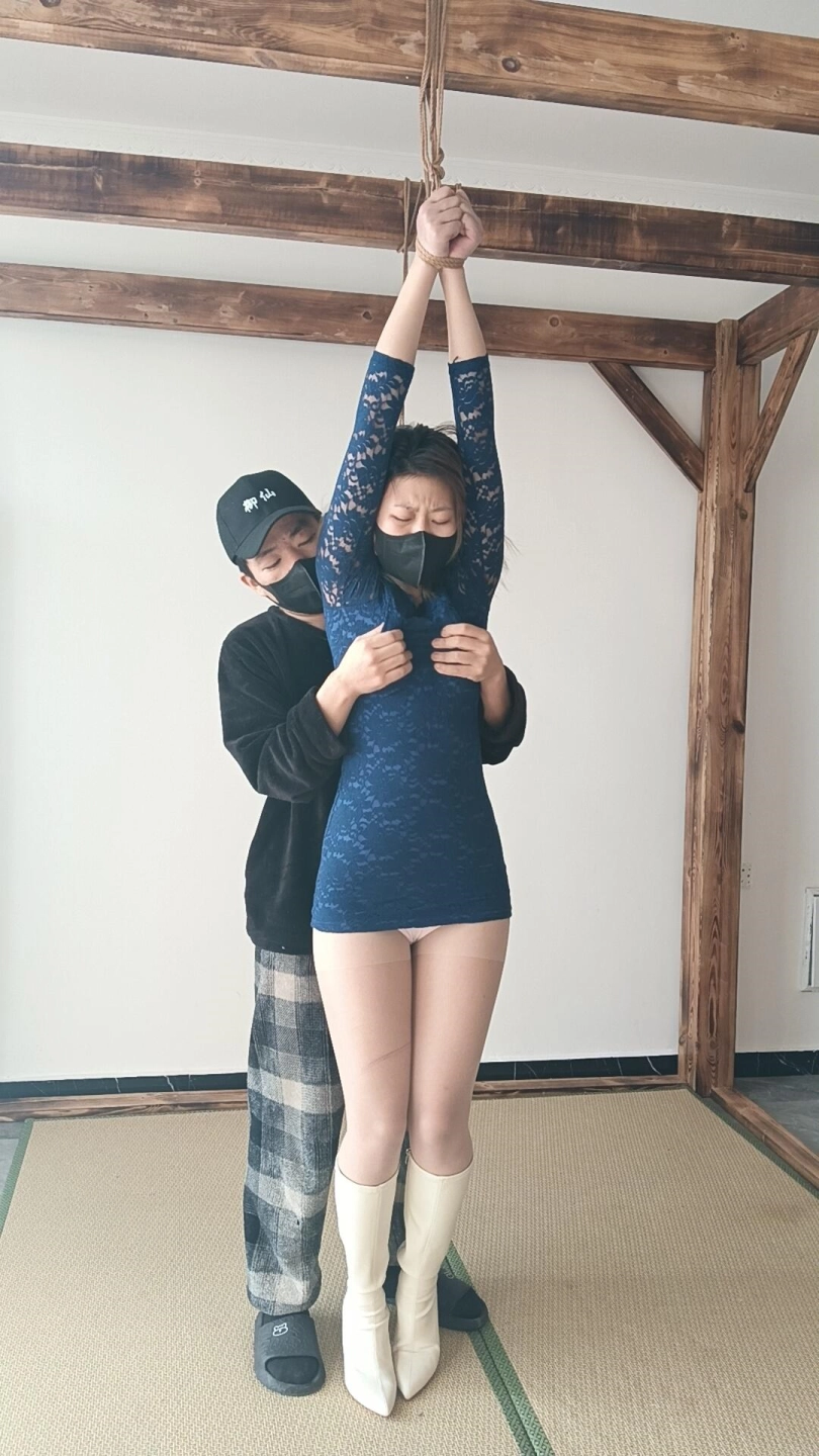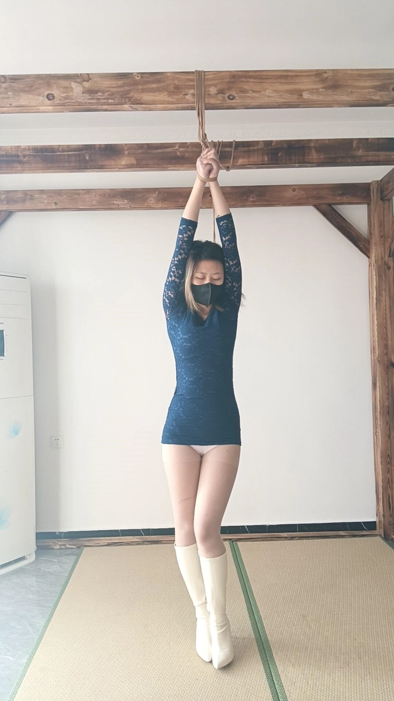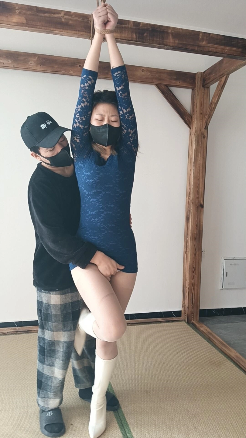 珺珺身着蓝色少妇战袍被双手吊起来,无法动弹,胸部被使劲的揉捏,感觉胸部快要被捏烂了,绑匪折磨完还是不解气,于是掐起他的脖子把他高高举起,最终珺珺窒x而死,匪徒于是决定奸shi.