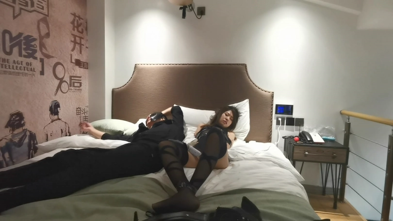 小插曲: 瑾萱一直这么被刺激着心里不平衡,对我说“要不你也来体验下这棒的感觉?”“好啊,只要你能用你被反绑的手拿到它就可以”。没想到她还真拿到了,看情况不妙本人赶紧背过身假装睡觉,谁知瑾萱看到后艰难的拿起棒棒对准我的臀部直接来句“看我爆你菊”。。 。哎,调皮!