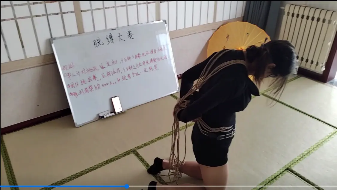 共三位美女参加(林晓雅,李伊可,玖儿),分为两部分:第一部分,个人竞速赛,同样驷马造型,速度快者优胜,慢着惩罚。第二部分,团队脱缚赛,在规定时间内完成则为优胜,未完成视为失败,予以惩罚。