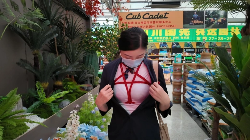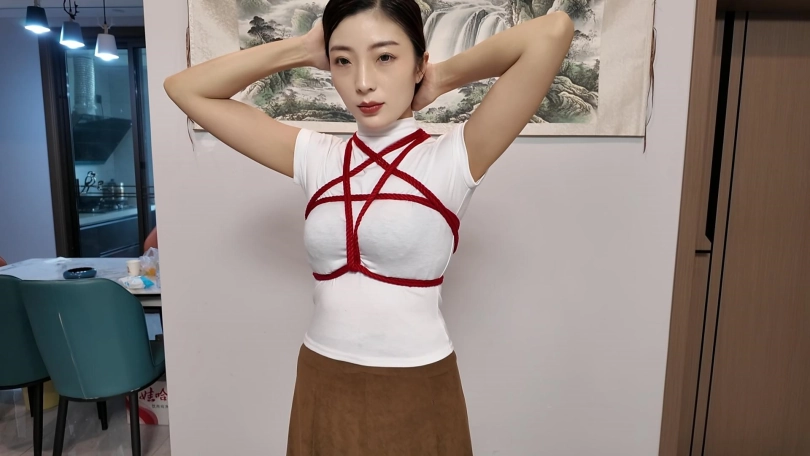 第二次带佳佳外出,带绳模外出必须捆上,白色体恤搭配红色绳子五角星,还是非常漂亮的,先去花卉市场,把工作室的几盆花更新一下,在带她去吃个饭,吃完饭带她去逛商场,抓娃娃,看电影,玩了一天,到家了免不得要吊起来调叫一番