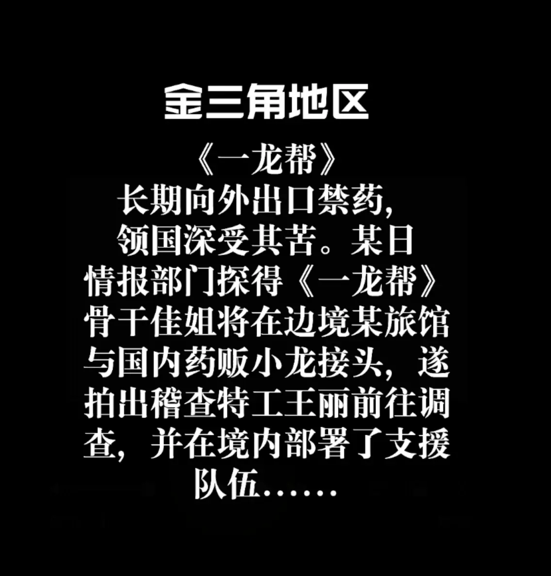 在臭名昭著的金三角地带,冷艳狠厉的一龙帮佳姐(佳佳 饰)对上精明矫健的稽查之花(晓亚 饰),猎手与猎物、S与M的角色在电光火石间反转,而由老板亲自饰演的大龙又会给这场逃杀带去怎样的变数……本集涉及元素有:黑丝长靴、肉丝高跟、格斗擒拿、手铐麻绳、分腿椅缚、西式直臂胸缚、挣扎硬绑、毛巾堵嘴等,有几分钟怀旧配乐但不会盖住演员的呻吟呜咽;预知3人最终命运如何,在那个混乱的时空,或许有不止一种可能……