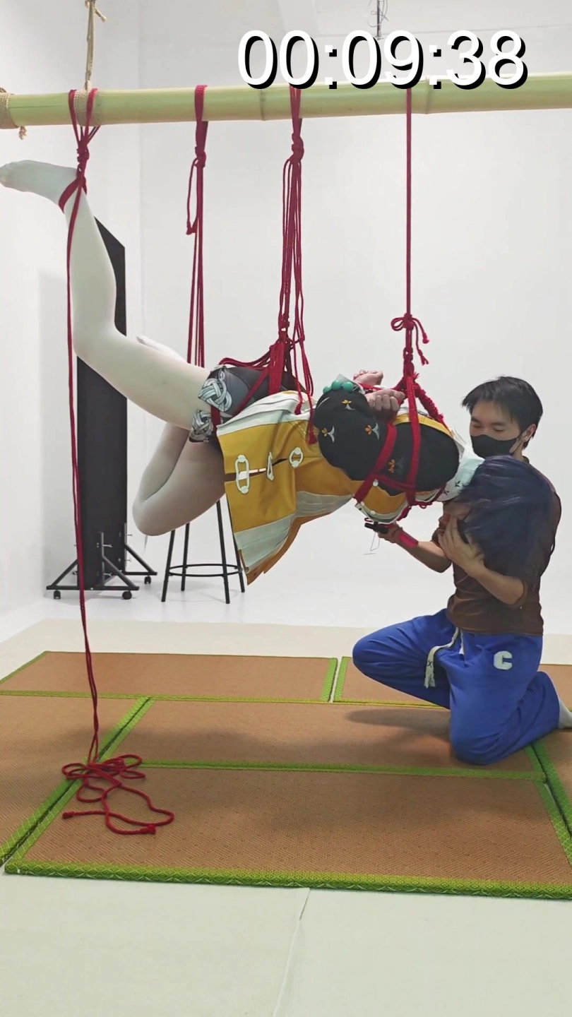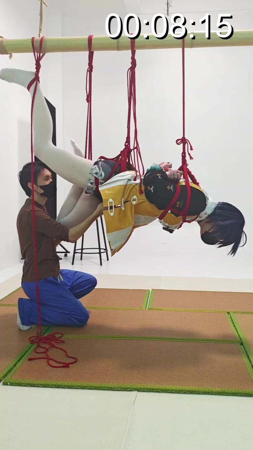 捆绑完之后当然是吊起来啦。一开始吊人可以一条腿一条腿慢慢来。让人有准备的升空。就不会很突然。至于后面出现的玩弄她的人。就不得而知了hhh