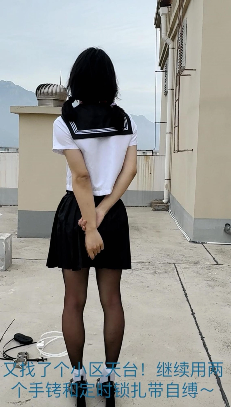 【柚里】天台手脚铐定时锁惊险自缚&脱白袜塞嘴毫无退路QAQ~摔倒腿都磕破了