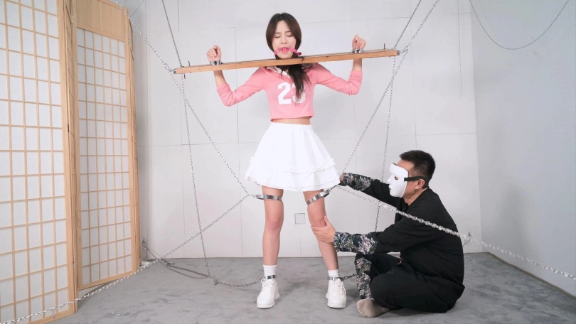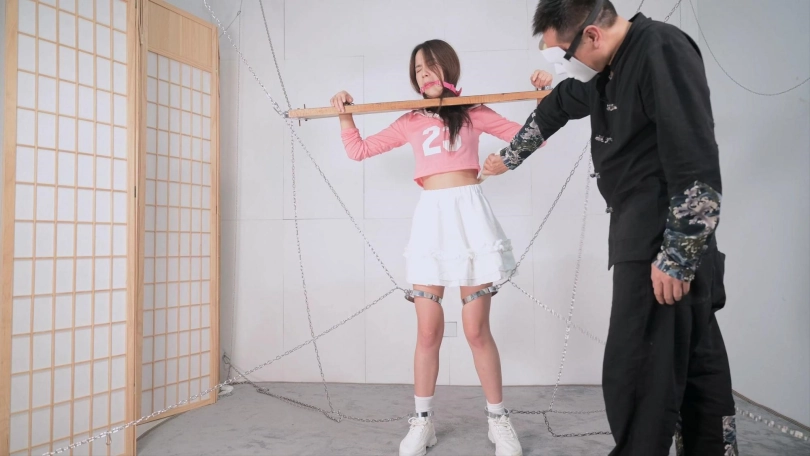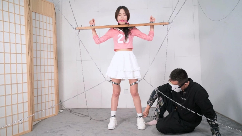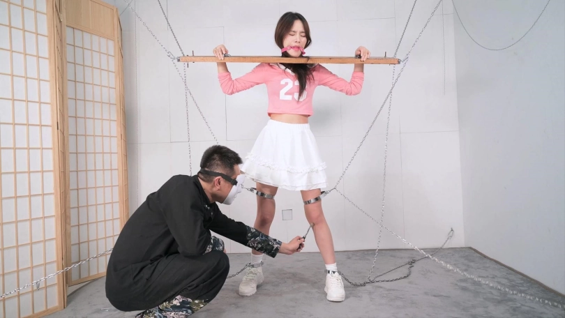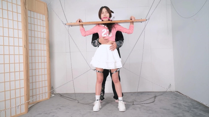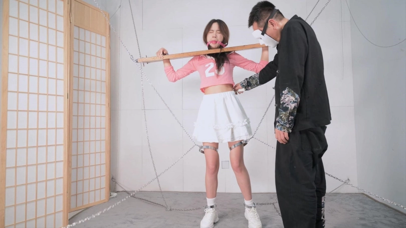 这个红色的足球宝贝的衣服本来是上衣加短裤,言妍自己搭配了一件学生气质的百褶裙,她这样一搭配,穿在她身上毫无违和感,加上白棉袜和加绒的运动鞋,这气质立马就出来了,把木枷吊起,腿上用了大腿铐,脚铐也用两根铁链限定了活动范围,言妍只能很小范围活动身体,这样放置简直太养眼了,经过TK、刺轮和电击器的攻击,她的呻吟声也激发出来了,对,就是我们喜欢的那个调调,又是声画俱美的片子!