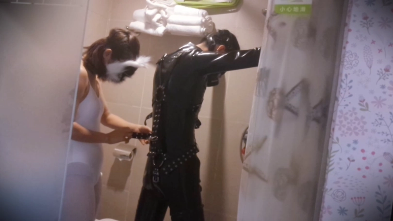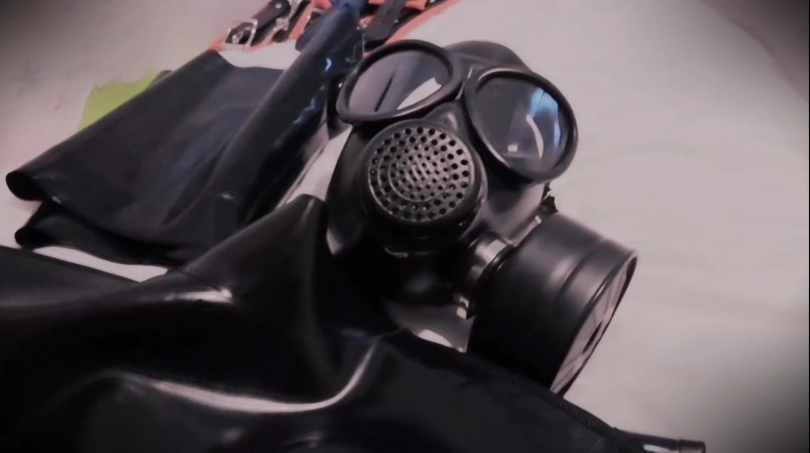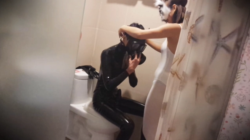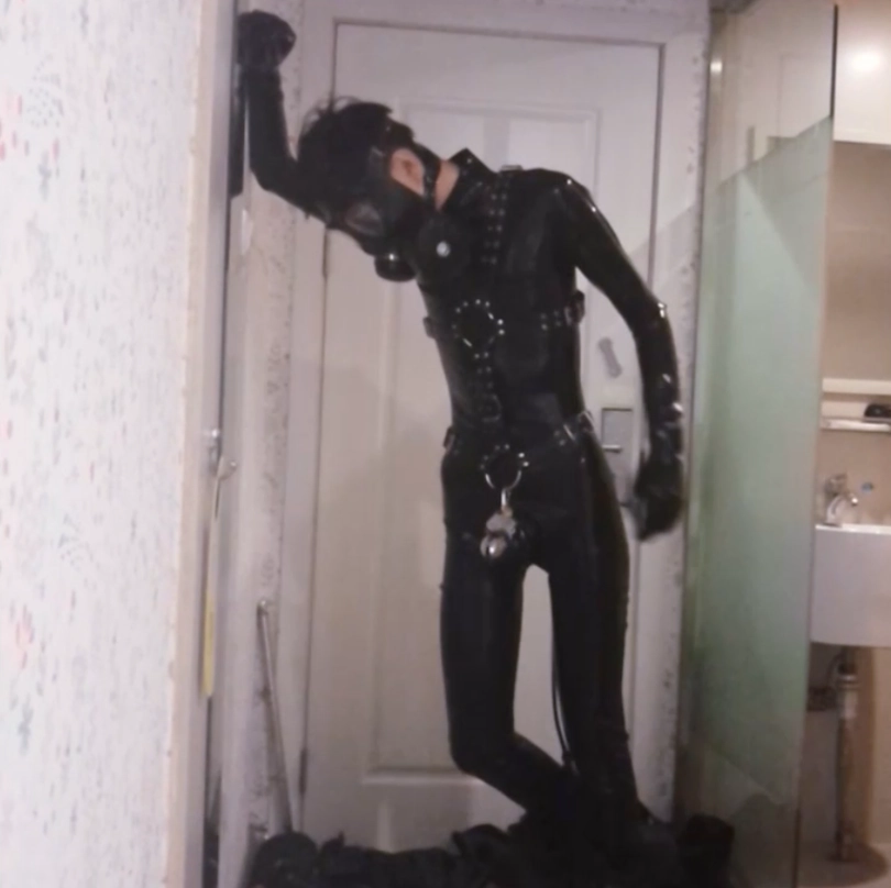 拍摄过程中,为了满足她的好奇心,就连我也被她要求穿上了乳胶紧身衣、拘束带、防毒面具甚至是贞操锁......紧接着就是给她各种穿戴着来玩:狗狗头套、防毒面具、下水服、口塞、带牙套笔管的头套......
